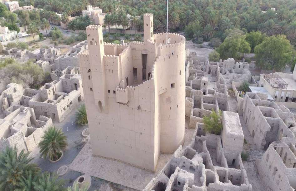 Manah (منح) is a town (population: 7,749) and the seat of Manah district (pop. 25,320) in the Ad-Dakhiliyah region. The word Manah in Arabic means ‘gift of God’, or ‘blessing’. The old town of Manah is one of Oman’s oldest archaeological sites and contains four mosques, 376 ancient houses, and almost 250 wells which are over nine centuries old. Al Fiqain castle, built in 1617, towers above the ancient ruins of the city, a dramatically beautiful site.